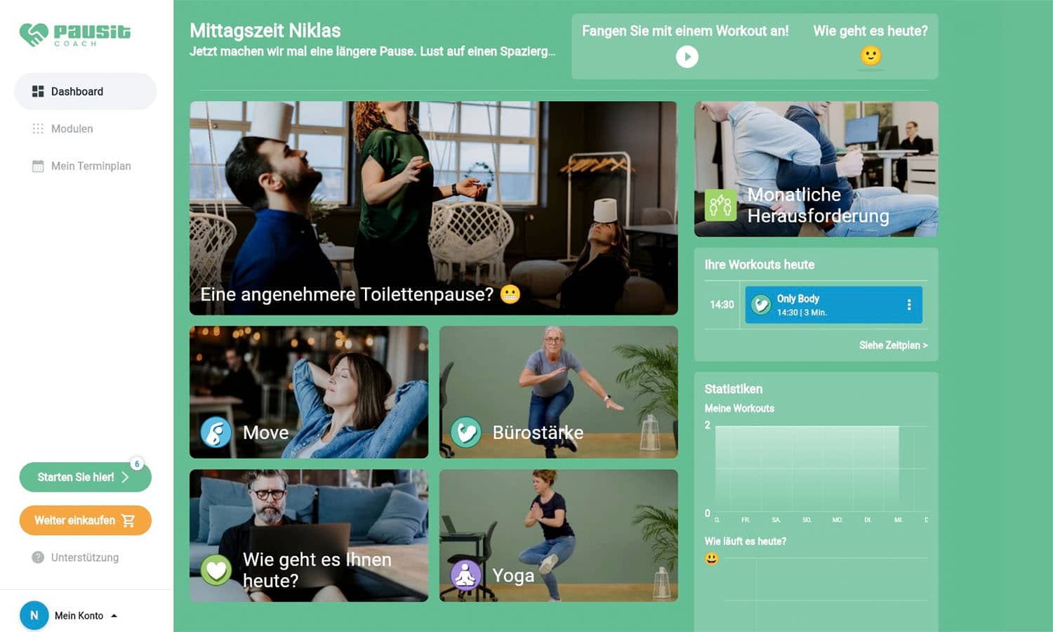 Die Funktionen „Statistik” und „Wie geht es Ihnen heute?” zeigen Trendlinien für absolvierte Einheiten und Ihr Wohlbefinden – direkt in Ihrem Dashboard. Was sagen die Kurven aus? Können Sie aus Ihren Statistiken Rückschlüsse ziehen?